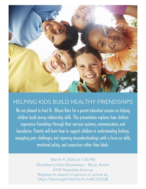 Events for March 2026 « All Dr. Allison Rees Discussion: Help Kids Build Healthy Friendships March 9th @ 7:00 pm at Strawberry Vale March 9 @ 7:00 pm Navigation « Family Day – No School Last Day of class before Spring Break » Register to Attend: see form at bottom of poster Add to calendar Google Calendar iCalendar Outlook 365 Outlook Live Details Date: March 9 Time: 7:00 pm